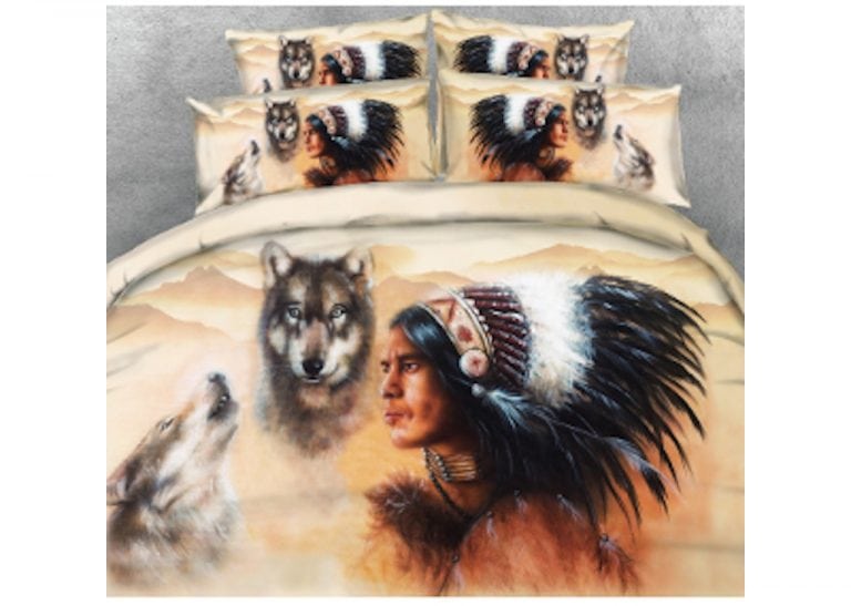 North American Indians are widely recognised for being one of the most spiritual races of people on Earth. This spirituality and connection with wolves is beautifully portrayed in the 3D imagery on this Queen sized Bedding Set – Indian Brave with Wolves.